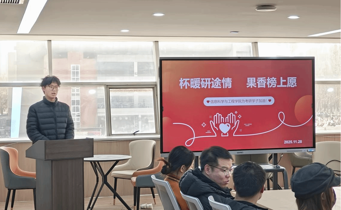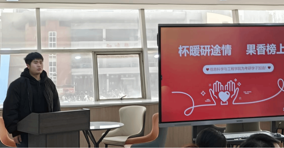学院暖心送祝福,考研学子战寒冬。11月28日,信息科学与工程学院在德园一站式社区成功举办“杯暖研途情,果香榜上愿”考研学子送温暖活动,活动由侯森老师主持,学院党委副书记魏雪芹、本科毕业班全体辅导员及考研学子代表参加了此次活动。