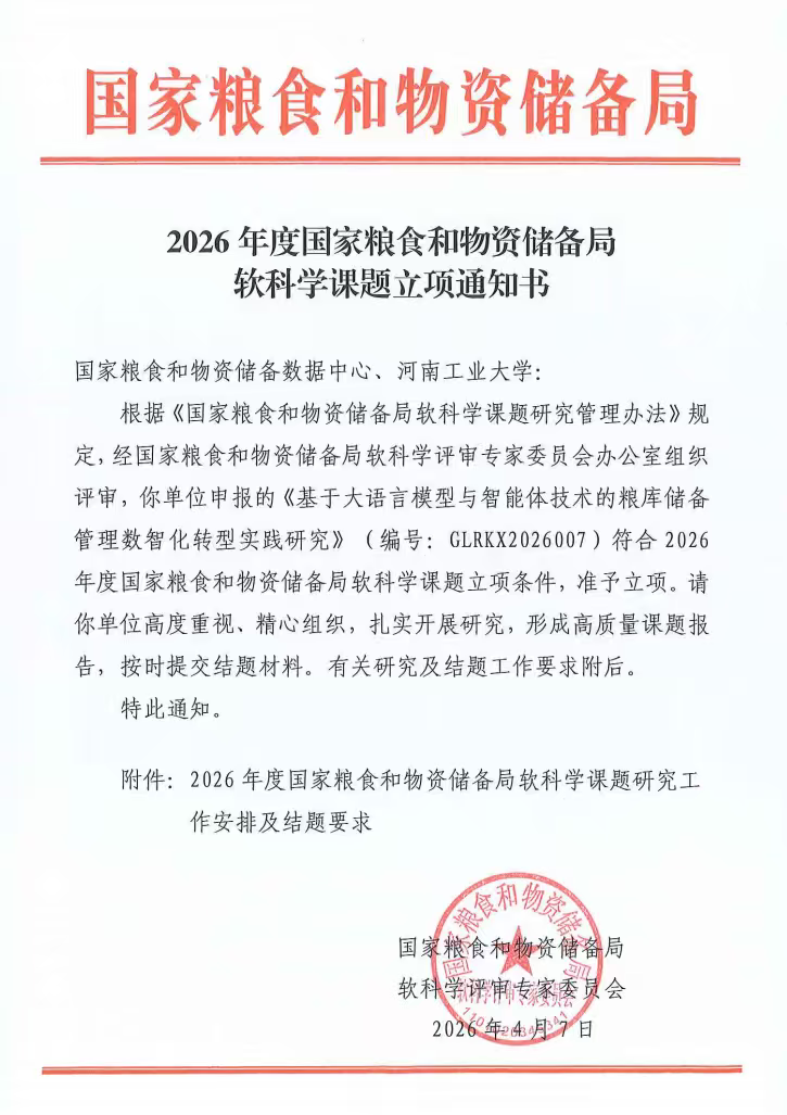近日,从国家粮食和物资储备局传来喜讯,2026年度软科学课题立项名单正式公布,国家粮食和物资储备数据中心联合河南工业大学申报的《基于大语言模型与智能体技术的粮库储备管理数智化转型实践研究》课题(课题编号:GLRKX2026007)成功获批立项。此次立项是我院深入贯彻国家粮食安全战略,推动粮食储备管理数智化转型的重要科研突破,充分彰显了学院在粮食行业信息化领域的深厚积淀与创新能力。