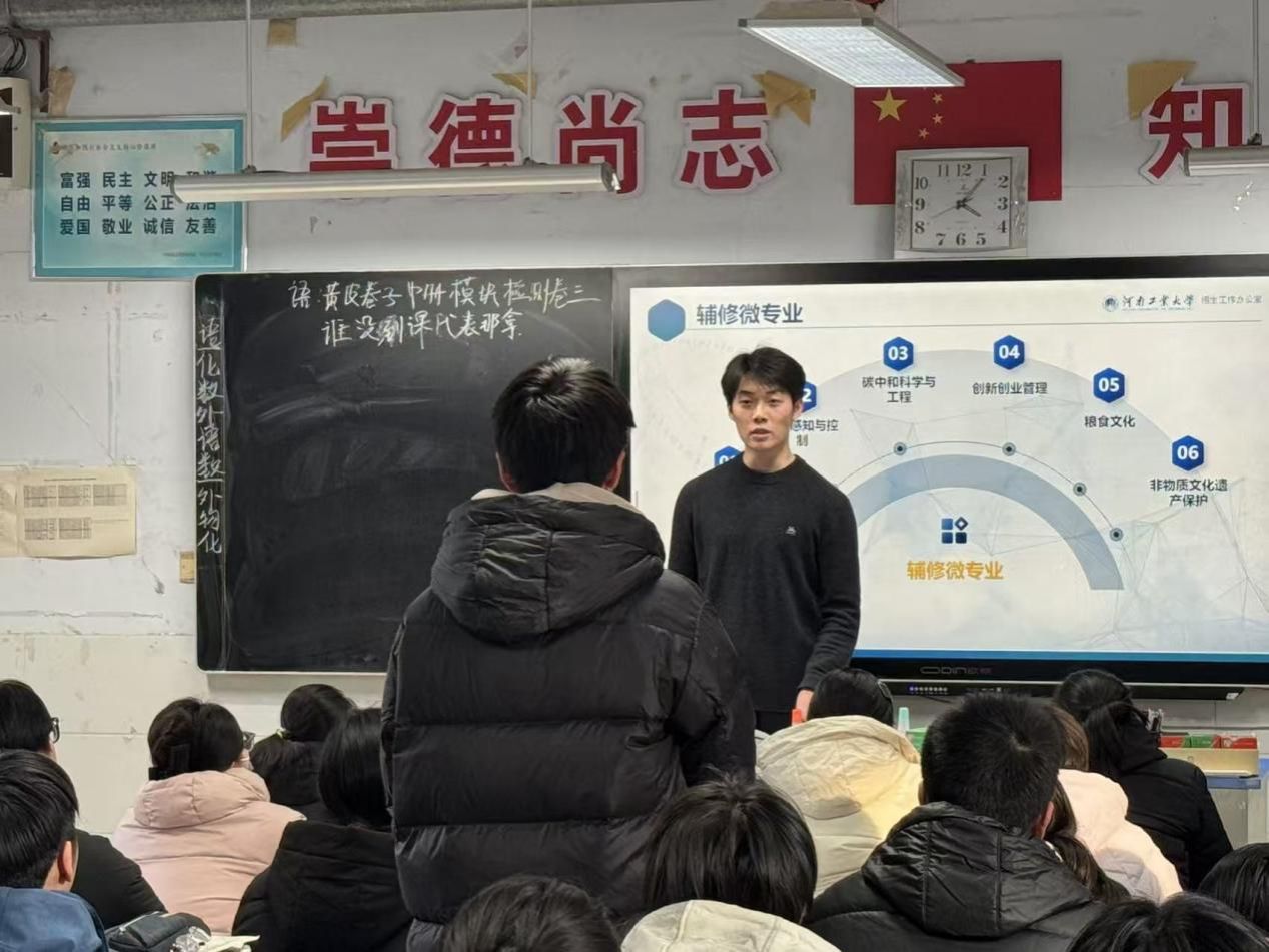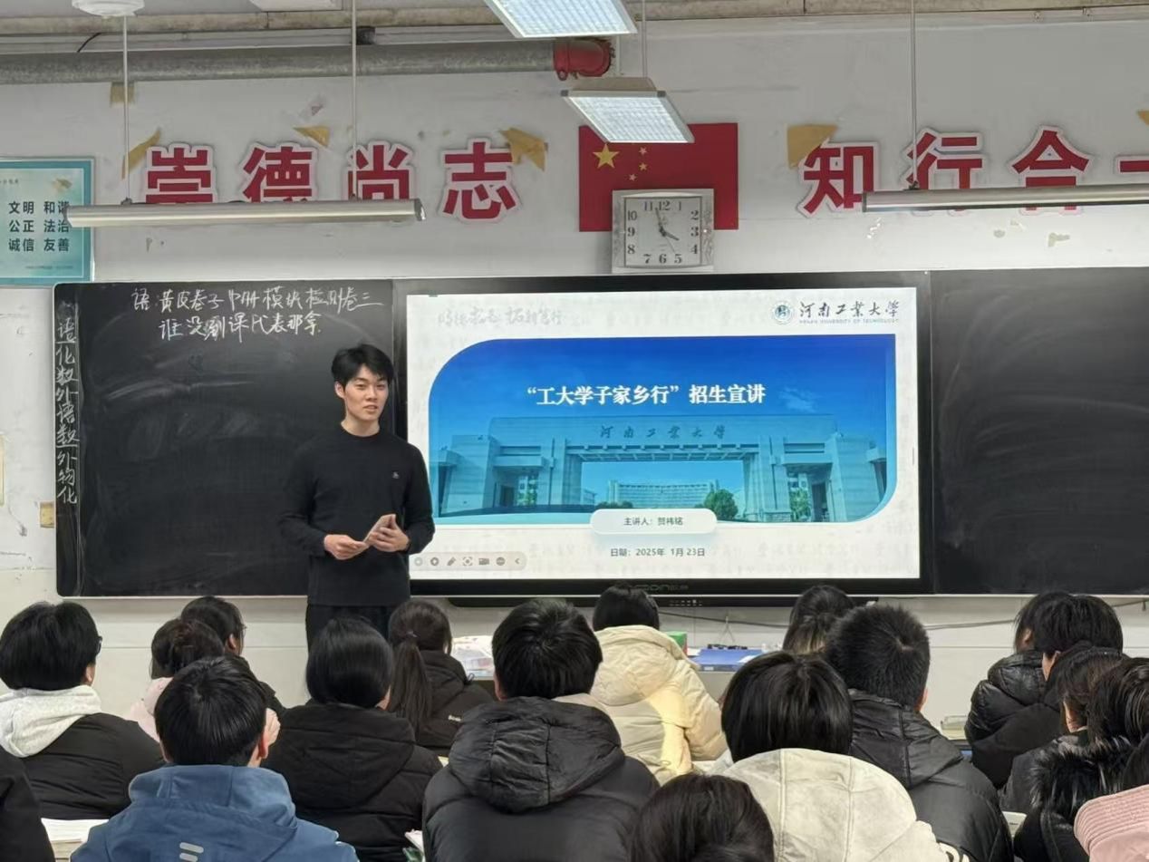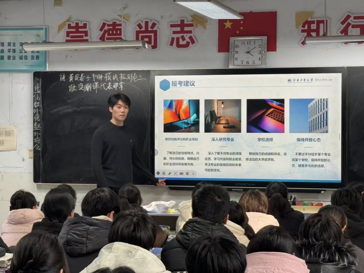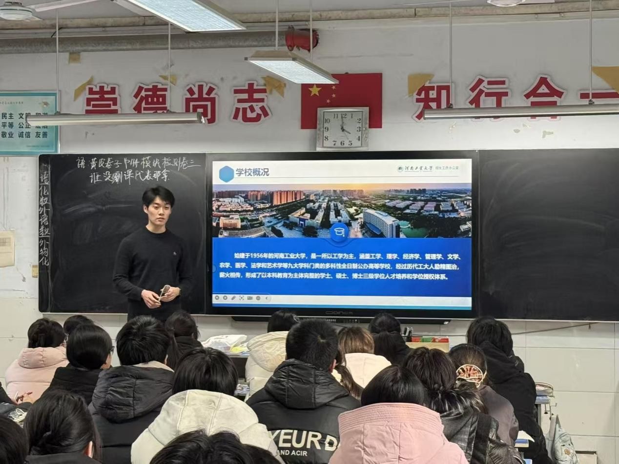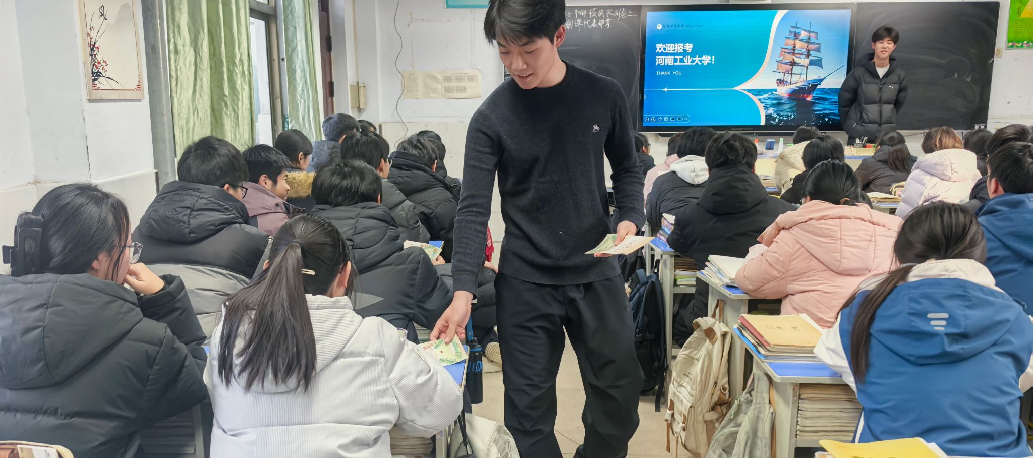 宣讲现场,以“学长”的亲切身份,从校情介绍、经验分享、互动赋能三个维度展开。在校情宣讲环节,通过“学科优势+就业前景+校园生活”的立体介绍,详细解读河南工业大学的办学理念、科研实力与人才培养特色,重点突出学校在行业内的领先地位与就业优势,让学弟学妹对高校生活建立清晰认知。随后,分享了自身从巩义二中到河南工业大学的成长轨迹,结合备考经历传授时间管理、错题整理、心态调节等实用技巧,鼓励大家“以坚定信念迎战高考,以不懈奋斗书写青春”。