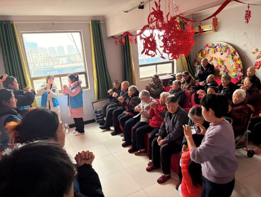 在郑州市惠济区颐和养老院,团队成员与工作人员充分沟通,了解老人们的生活状况后,开展了丰富的互动活动。手指操教学环节中,队员们耐心演示每个动作,一对一指导老人练习;自由交流时,大家俯身倾听老人们的岁月故事,用真诚回应传递关怀;文艺互动环节,合唱经典老歌、趣味小游戏轮番上演,老人们还主动献上戏曲表演,养老院里处处洋溢着欢声笑语。