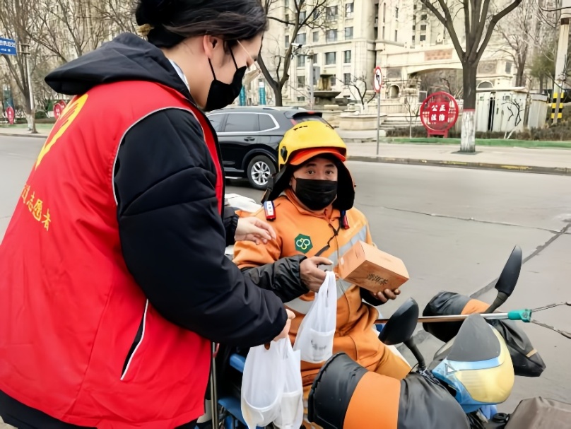 社区实践中,团队兵分两路开展活动。2月2日清晨,队员们前往社区工会服务站点,协助熬制驱寒姜茶,为坚守岗位的环卫工人、快递员等户外劳动者送上热茶与保暖手套,在交流中体悟劳动奉献精神。