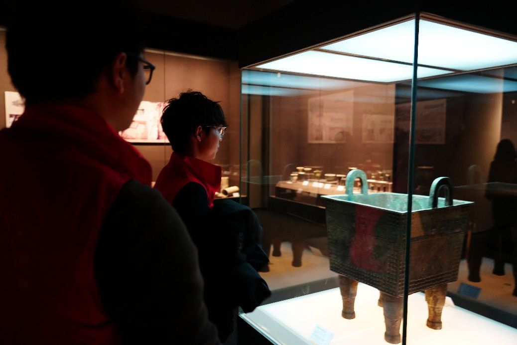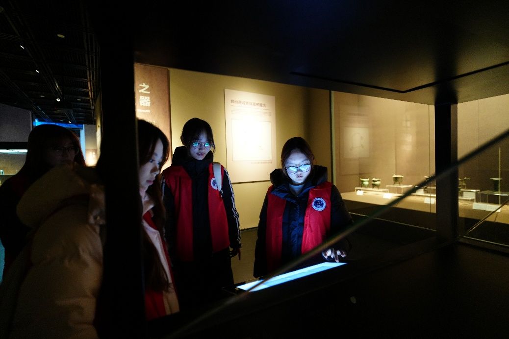 在商代青铜方鼎前,队员们围绕器物的铸造工艺、纹饰寓意展开深入探讨,工作人员补充介绍了该方鼎在研究商代祭祀文化和青铜铸造技术中的重要价值,让队员们对古人的智慧与技艺深感敬佩。